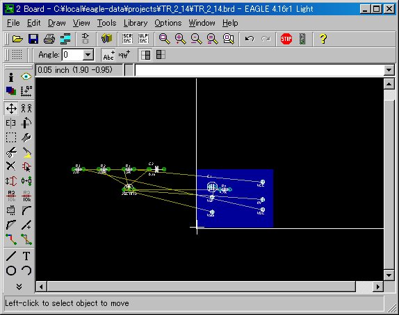 回路図を開いたまま、プリント基板図を表示すると、基板領域の左外側に部品が並んでいるので、 基板領域にドラッグして配置する。