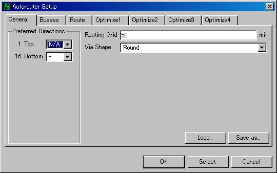 配置が完了したら、Eagleの自動配線機能を使ってプリントパターンを生成する。 ここで、Autorouter SetupのGeneralタグのTopをN/A、Bottomを-とすることで、 片面のプリント基板に対する自動配線が実行される。